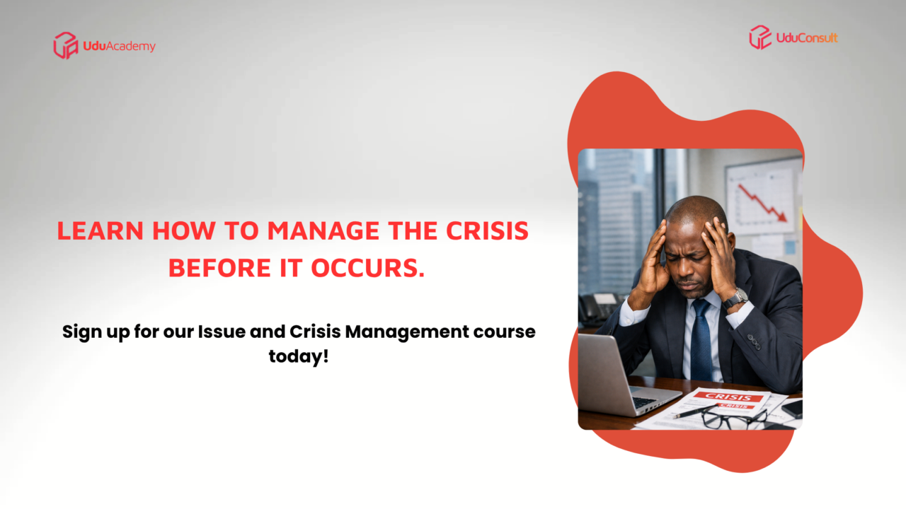 Following the successful delivery of its ‘Introduction to Public Relations & Stakeholder Management’ training held on 27 March, Udu Consult is pleased to announce its next capacity‑building programme: Issue and Crisis Management Training, scheduled for 5 June 2026.
